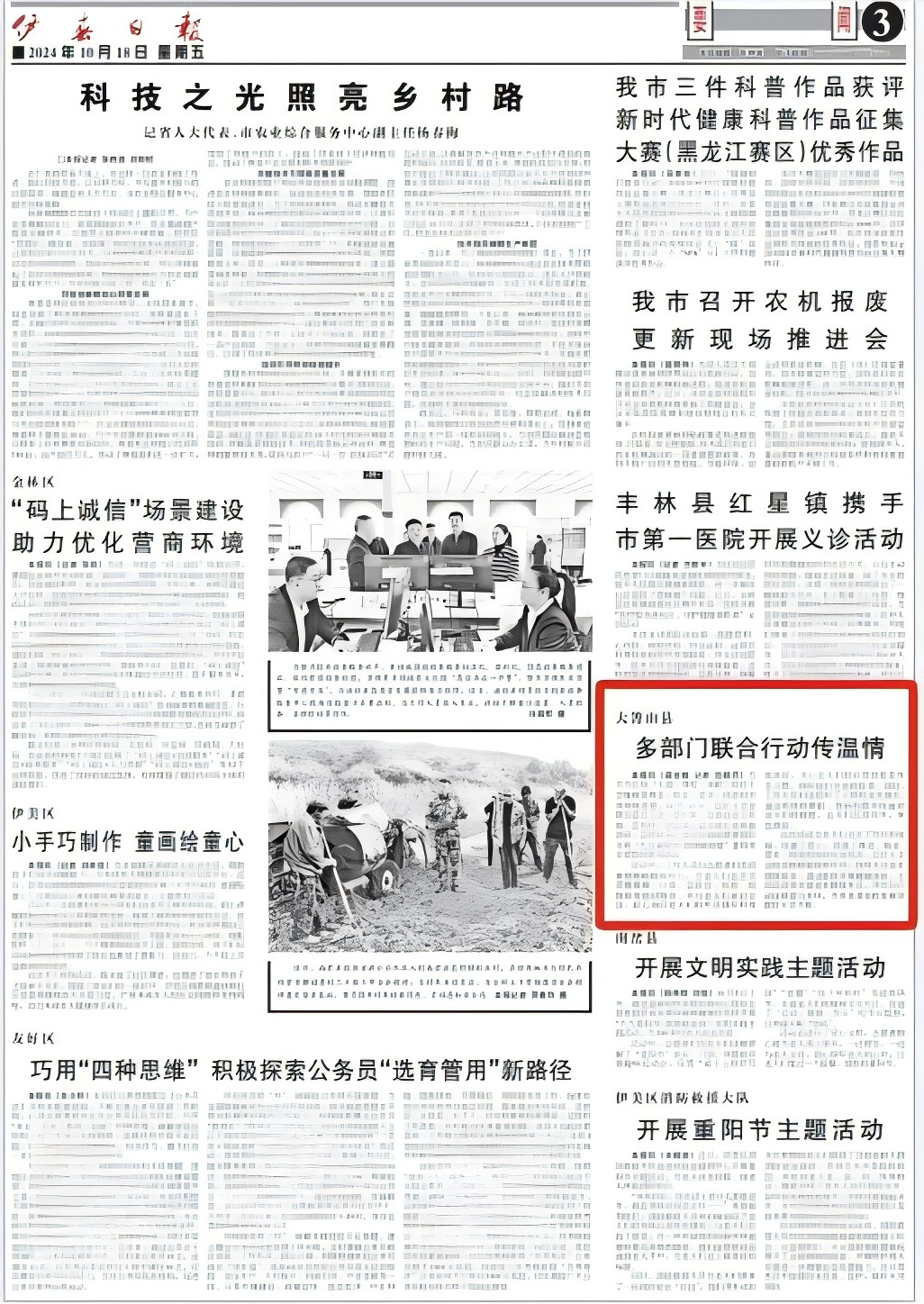 活动中,工作人员与志愿者们共同来到带岭颐养中心,为老人们送去艾草捶捶棒、口罩、急救包、纸抽、购物袋等慰问物资,并与老人们亲切交谈,耐心询问老人们的生活情况和身体状况,关心老人们的日常饮食及作息习惯,倾听他们往昔的故事。同时,工作人员们还组织了小型的文艺演出,通过欢快的舞蹈、悠扬的歌声传递对老人们的敬意,老人们沉浸其中,笑容满面。