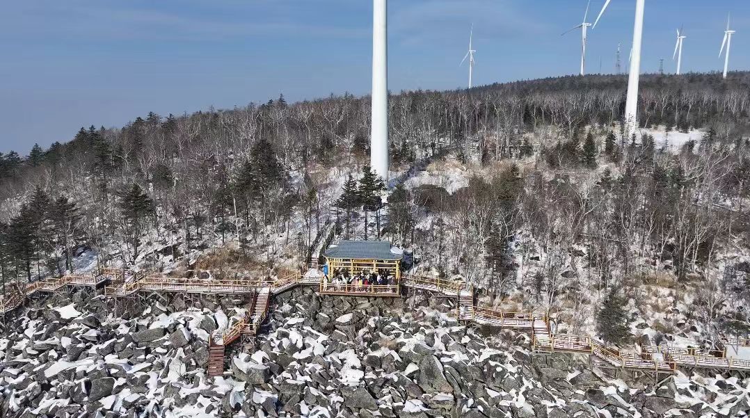 冬日里的大箐山森林公园,绵延的森林被皑皑白雪覆盖,阳光穿透晶莹的冰晶,折射出绚丽的七彩光芒。山岩、白雪、风车,形成了鲜明的视觉对比。共同描绘出一幅如梦似幻的冰雪童话世界。