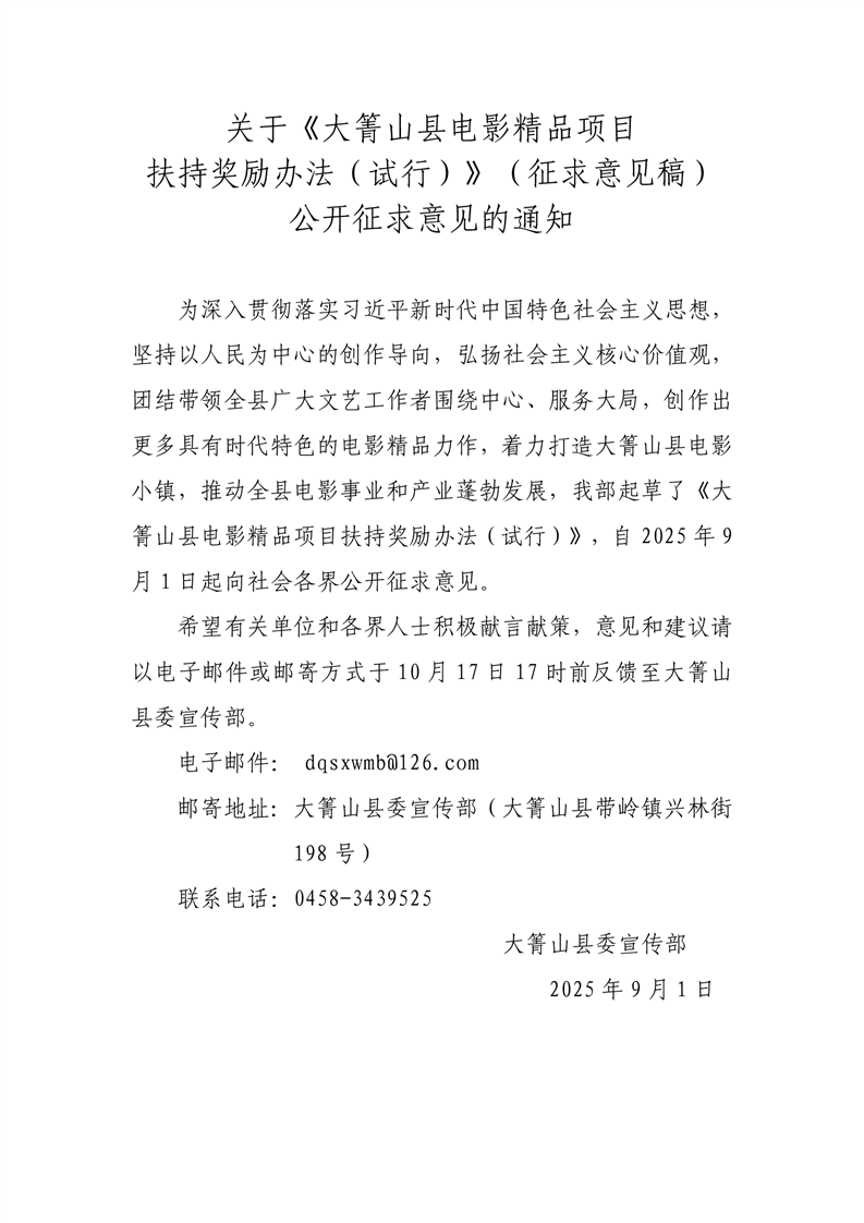 关于《大箐山县电影精品项目扶持奖励办法(试行)》(征求意见稿)公开征求意见的通知