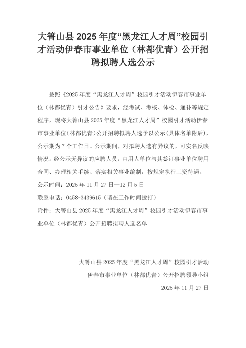 大箐山县2025年度“黑龙江人才周”校园引才活动伊春市事业单位(林都优青)公开招聘拟聘人选公示