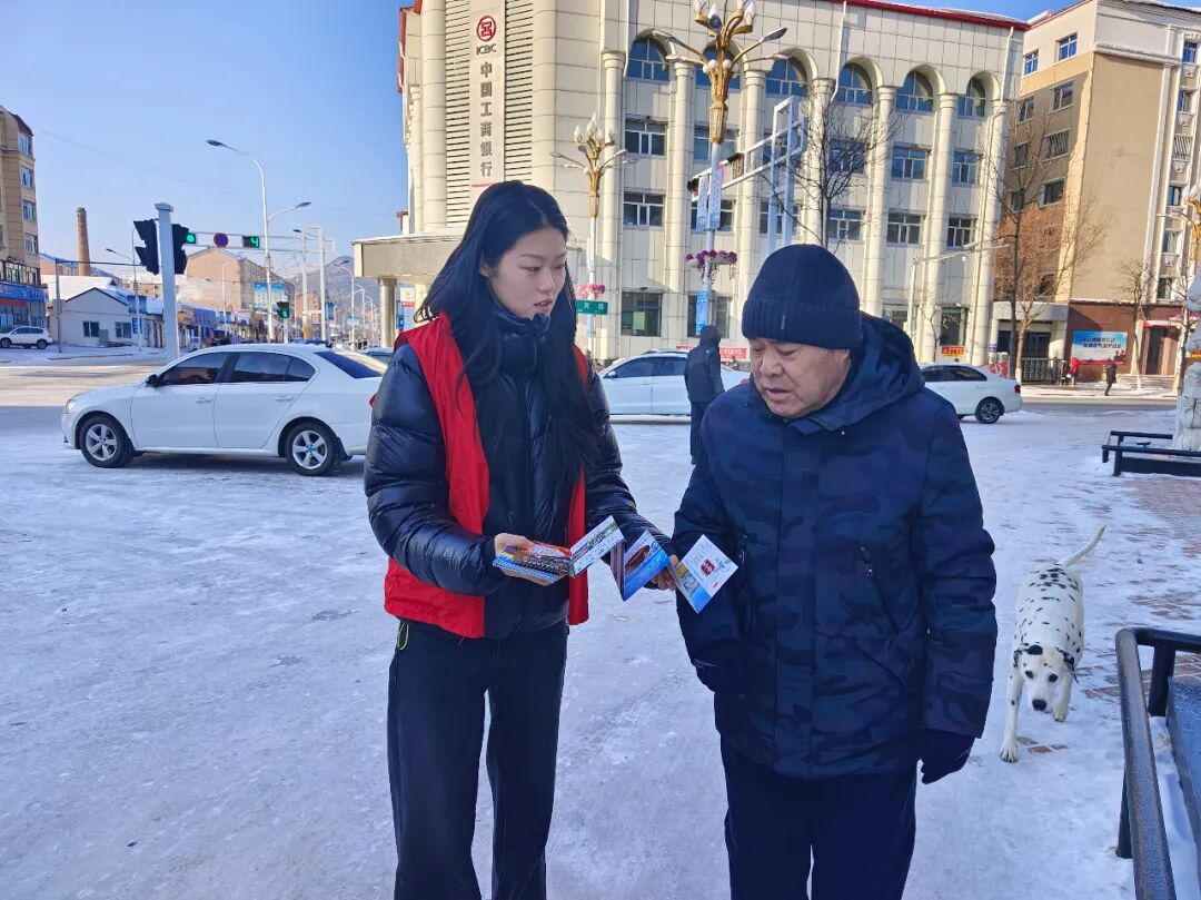 活动中,志愿者们化身“冬季旅游宣传员”,深入镇内休闲广场、交通车站等人流密集区域,手持精心设计的宣传单页热情揽客。大家围绕我县冬季旅游亮点,用生动的语言向过往群众推介玉树琼花的雾凇奇景、银装素裹的林海雪原,更细数热气腾腾的特色农家菜肴,全方位展现家乡冰雪风光与民俗风情的独特魅力;同时积极倡导“人人都是宣传员”的理念,鼓励居民主动分享家乡美景至朋友圈、短视频平台,向亲友同事推介带岭冰雪风光,以实际行动为家乡文旅宣传助力,不少居民当场响应,愿当家乡“代言人”。