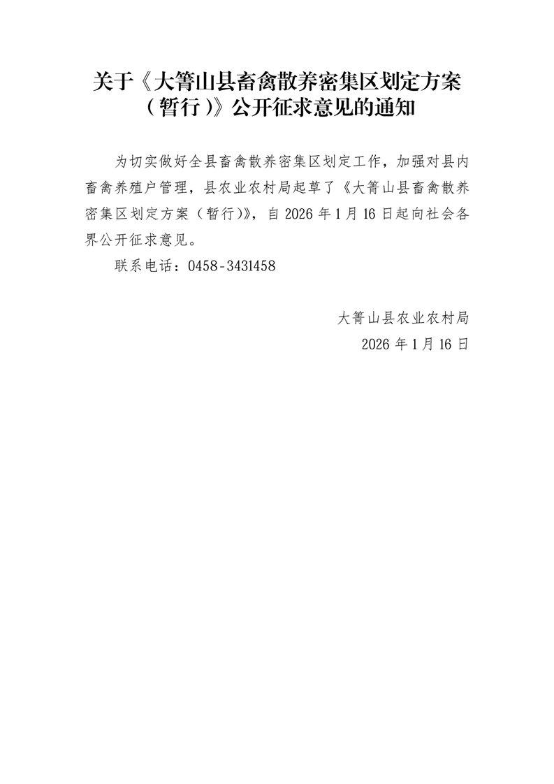 关于《大箐山县畜禽散养密集区划定方案(暂行)》公开征求意见的通知