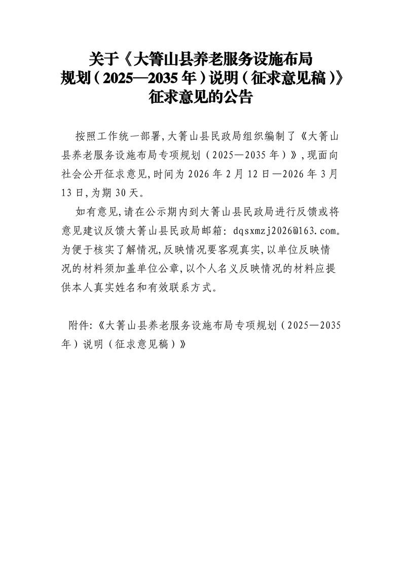 关于《大箐山县养老服务设施布局规划(2025—2035年)说明(征求意见稿)》征求意见的公告