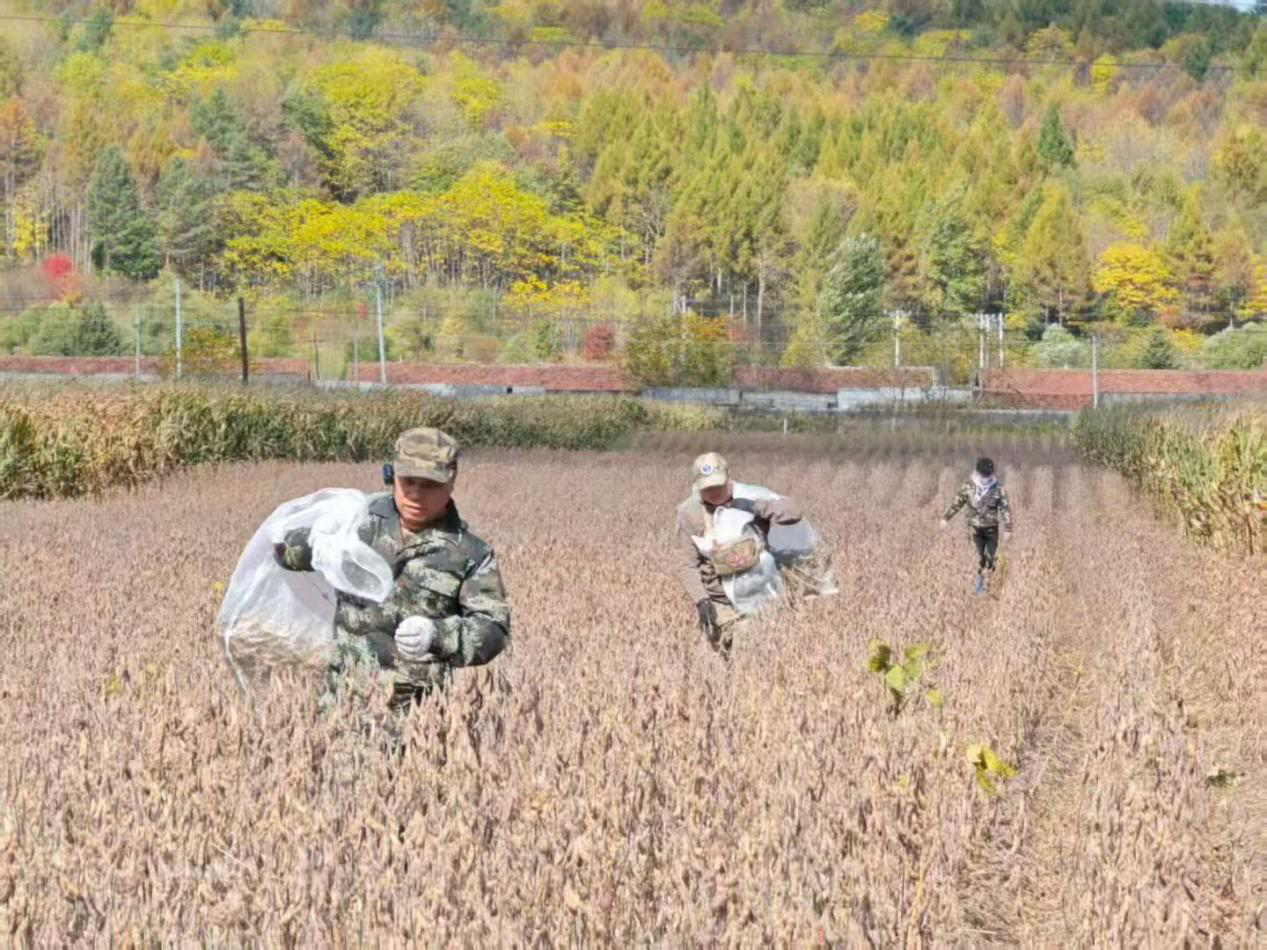 田埂上,脚步匆匆;田地间,俯身忙碌。调查人员俯下身,将测规内的玉米一株株小心翼翼地掰下,确保“颗粒归仓”,不遗漏一穗一荚。在相邻的大豆地块,他们更是轻手轻脚,防止豆荚炸裂,确保样本完整。