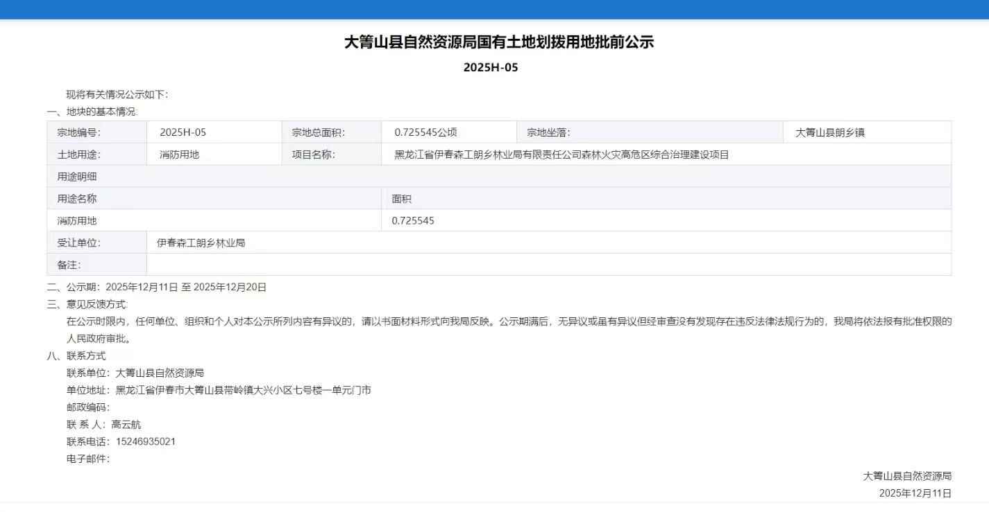 大箐山县自然资源局国有土地划拨用地批前公示