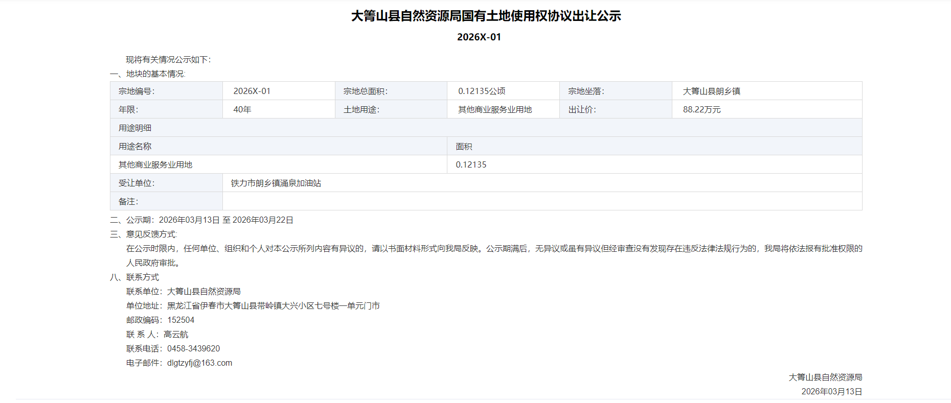 大箐山县自然资源局国有土地使用权协议出让公示