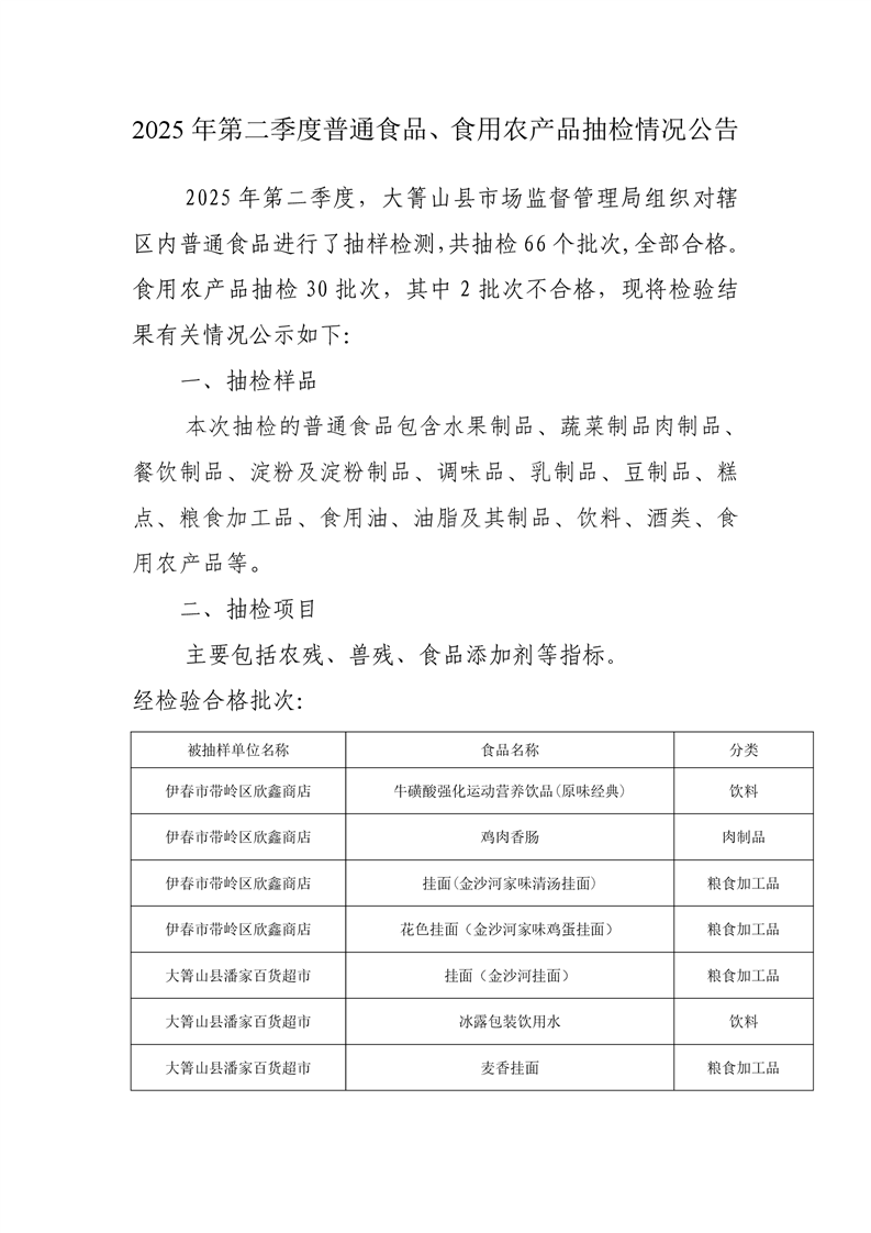 2025年第二季度普通食品、食用农产品抽检情况公告