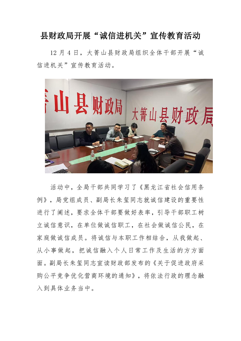 大箐山县财政局开展“诚信进机关”宣传教育活动