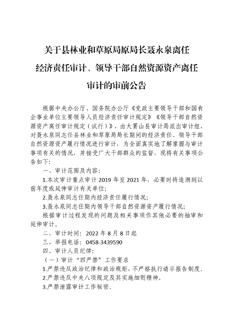 关于县林业和草原局原局长聂永泉离任经济责任审计、领导干部自然资源资产离任审计的审前公告