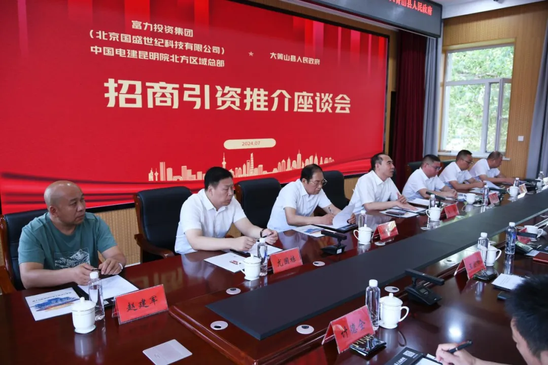 7月18日,富力投资集团(北京国盛世纪科技有限公司)·中国电建昆明院北方区域总部·大箐山县人民政府招商引资推介座谈会在机关大会议室召开。县长孙兰松主持会议并讲话。粤港澳大湾区智库理事长、投资局主席、中国富力投资集团董事长王宁,副总裁候昭忠、尤国栋、孙红心、赵建军,中国电建昆明院北方区域总部总经理温耀华,副总经理韦巍,县领导于佩利、张文君、王登峰、程龙及相关部门负责同志参加会议。